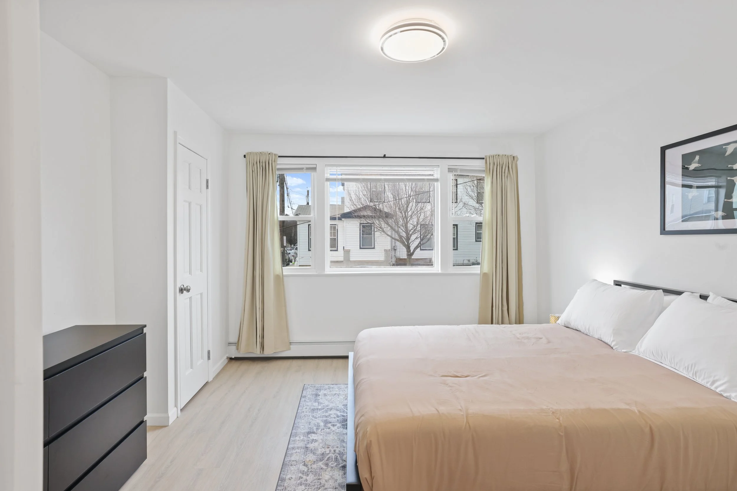 3 bedrooms, one featuring full size bed and remaining too featuring queens. Each bedroom boasts storage for foldable clothes as well as closets with hangers included for hanging.